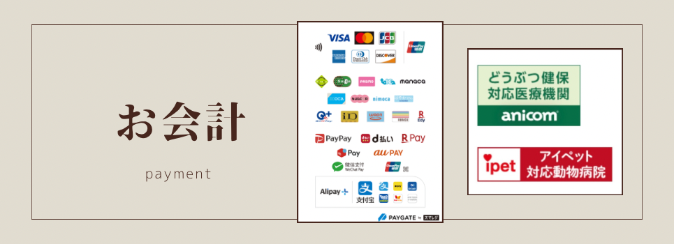 保険の窓口清算は「アニコム損保」、「アイペット」のみ対応しております。保険証をご持参いただき、受付までお声がけください。他の保険に関しましては、病院側では診断名などの必要事項を記入いたしますが、保険金のご請求は飼い主様ご自身で保険会社様に直接ご請求いただきますよう、ご協力お願いいたします。
