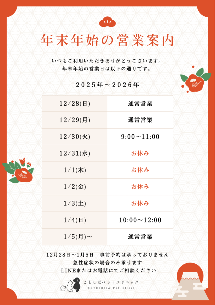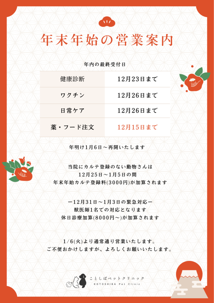 年末年始の営業に関しまして変更点がございますので、ご来院前にご確認ください。