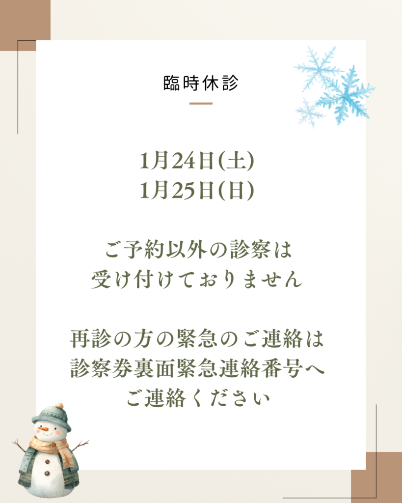 臨時休診 2026.01.23 Post Share Hatena Pocket RSS feedly Pin it 記事のタイトルとURLをコピーする 記事のタイトルとURLをコピーする Post Share Hatena Pocket RSS feedly Pin it 1月からの変更点について 前の記事 順番受付が始まります 次の記事