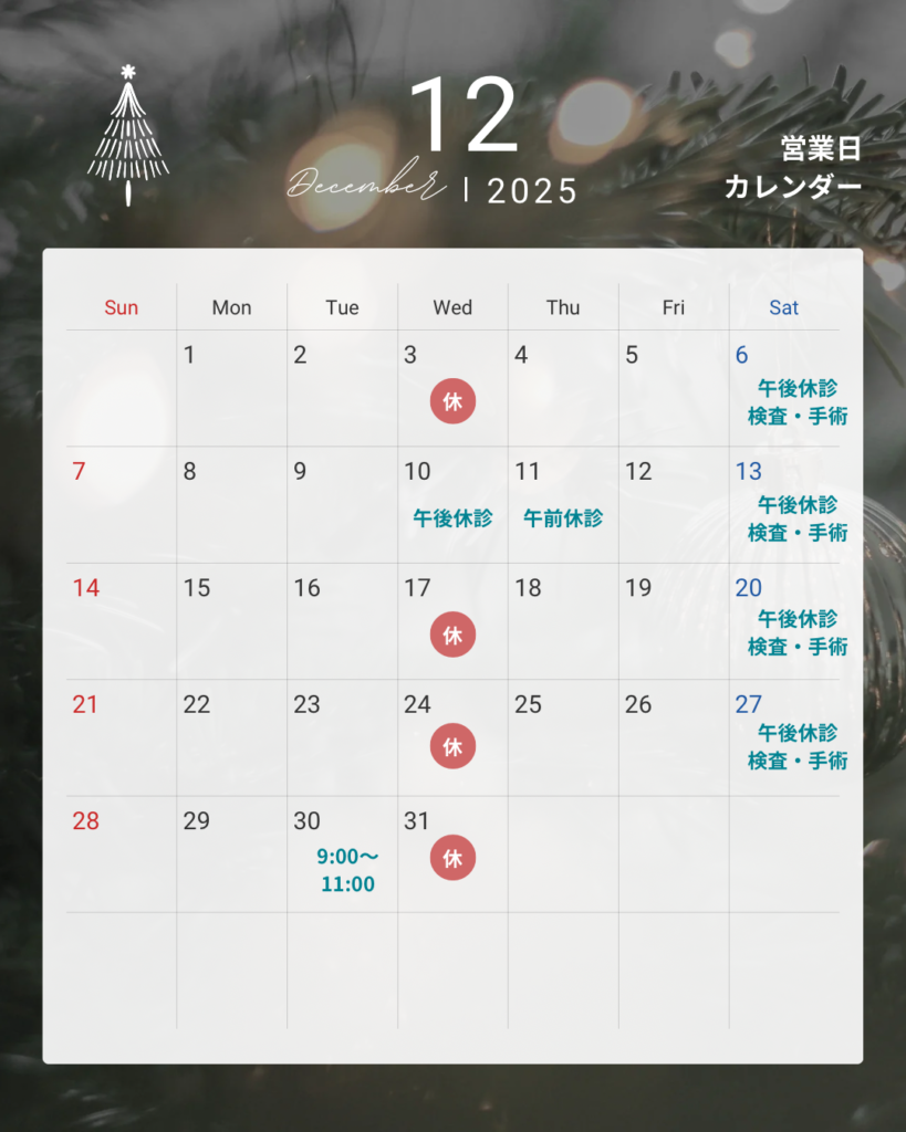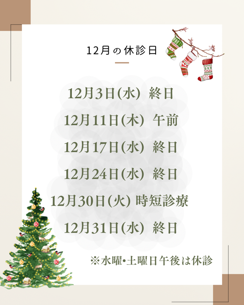 12月の休診日 2025.12.04 Post Share Hatena Pocket RSS feedly Pin it 記事のタイトルとURLをコピーする ※年末年始の営業は別途お知らせします 記事のタイトルとURLをコピーする Post Share Hatena Pocket RSS feedly Pin it 11月の休診日 前の記事 年末年始のお知らせ 次の記事